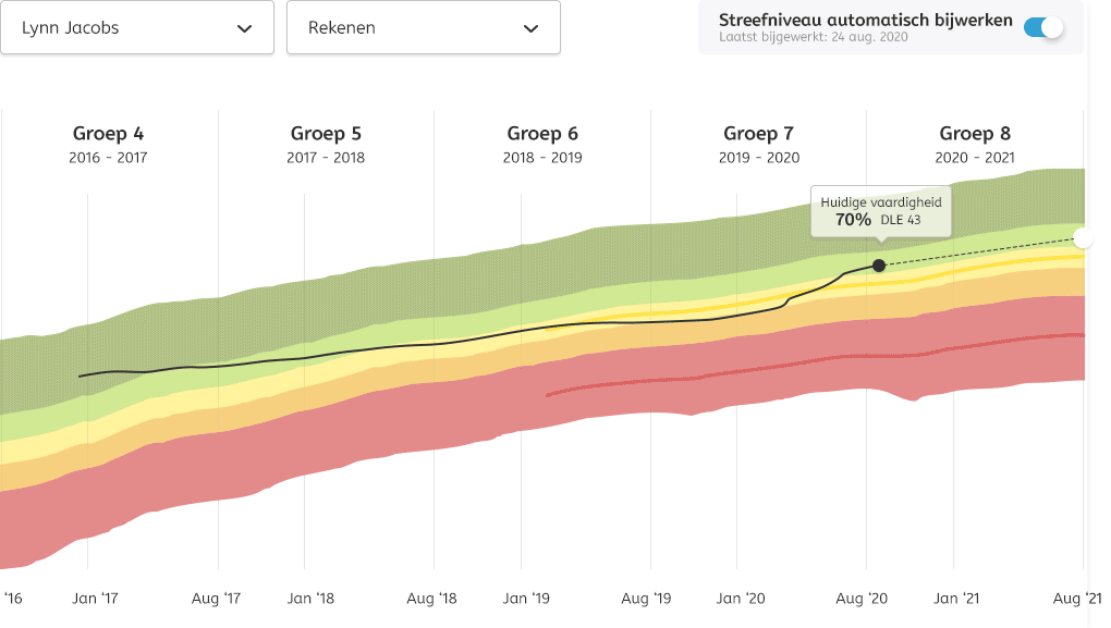 De huidige vaardigheid en groei worden berekend ten opzichte van het landelijke gemiddelde. Hierbij wordt alles wat de leerlingen maken in Snappet meegenomen, dus zowel opgaven in de les en in de extra instructie als adaptieve opgaven. Behalve de toetsen, die worden niet meegenomen.
